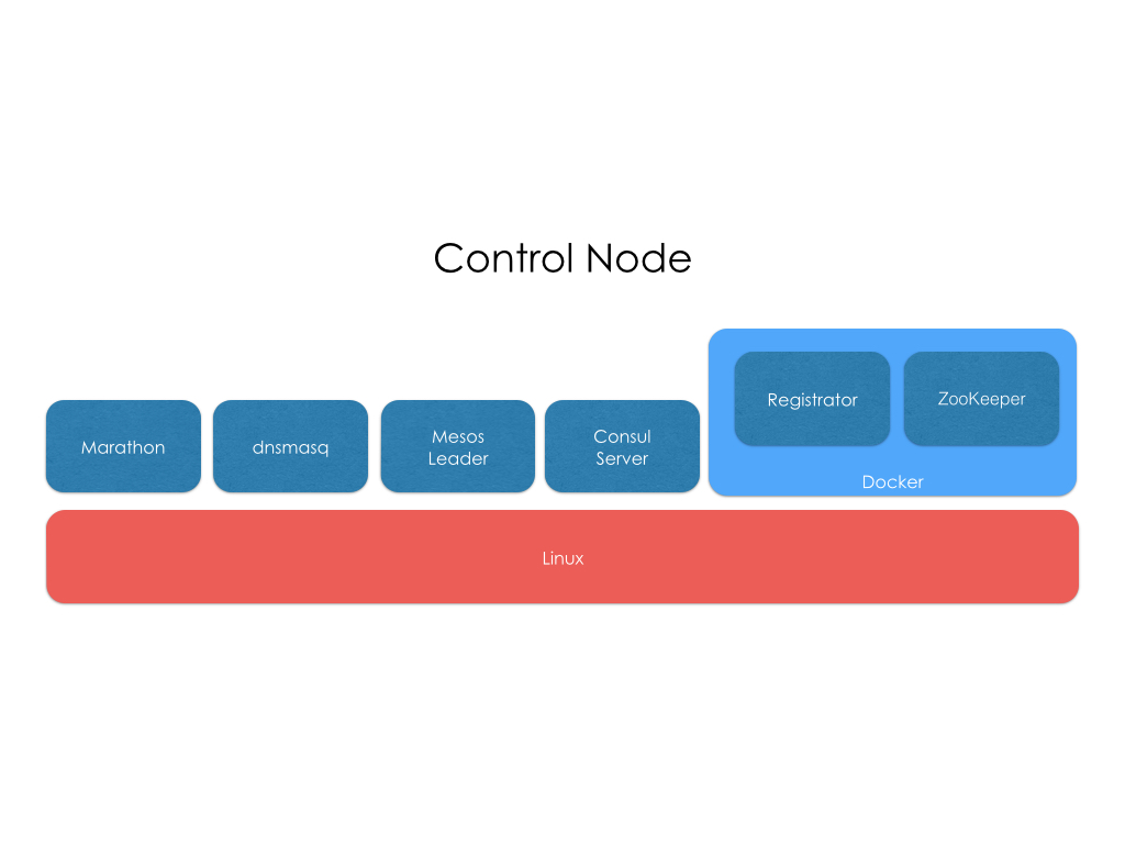 The control nodes manage a single datacenter. Each control node runs Consul for service discovery, Mesos leaders for resource scheduling and Mesos frameworks like Marathon.
