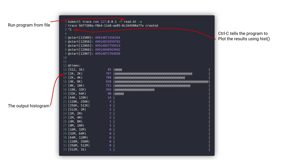 kubectl trace 支持单行方式或者脚本文件方式,比如