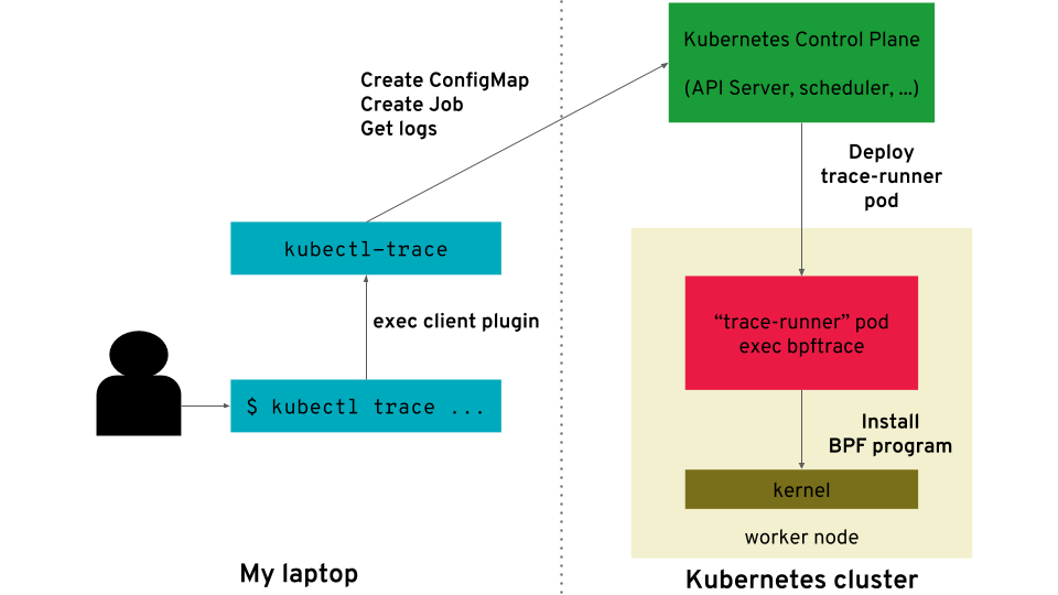在 Kubernetes 集群中,你可以通过 kubectl trace 简化 bpftrace 的调度和运行。其运行原理如下图所示: